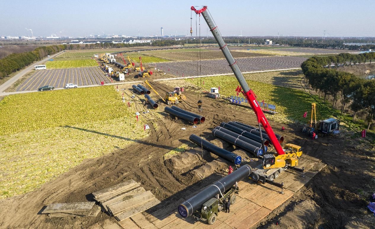 Natural gas pipelines are being installed for a major gas project in Huangjing township, Taicang, east China’s Jiangsu province, Feb. 25, 2022. (People’s Daily Online/Ji Haixin)