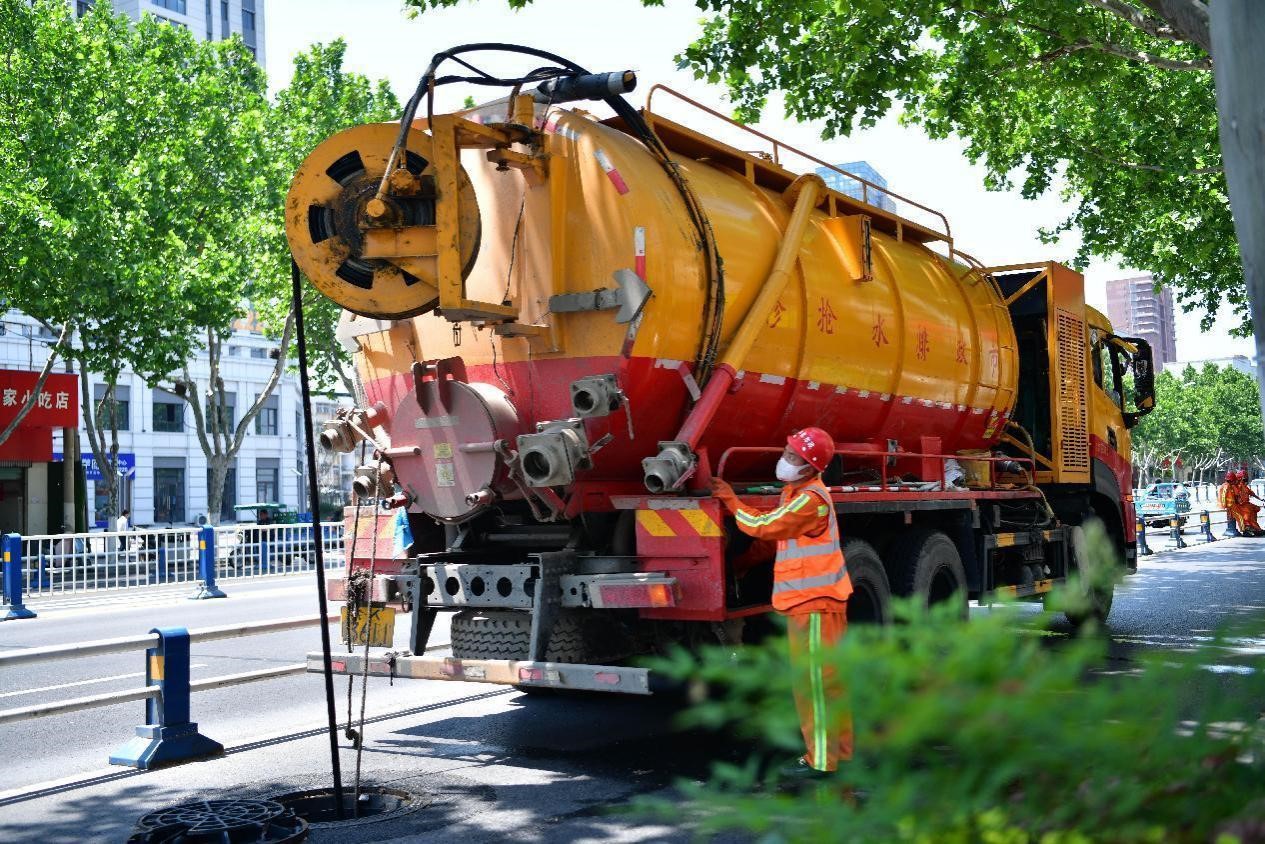 Workers dredge urban pipelines in Qinghexi Road, Fuyang, east China’s Anhui province, May 3, 2022. (People’s Daily Online/ Dai Wenxue)