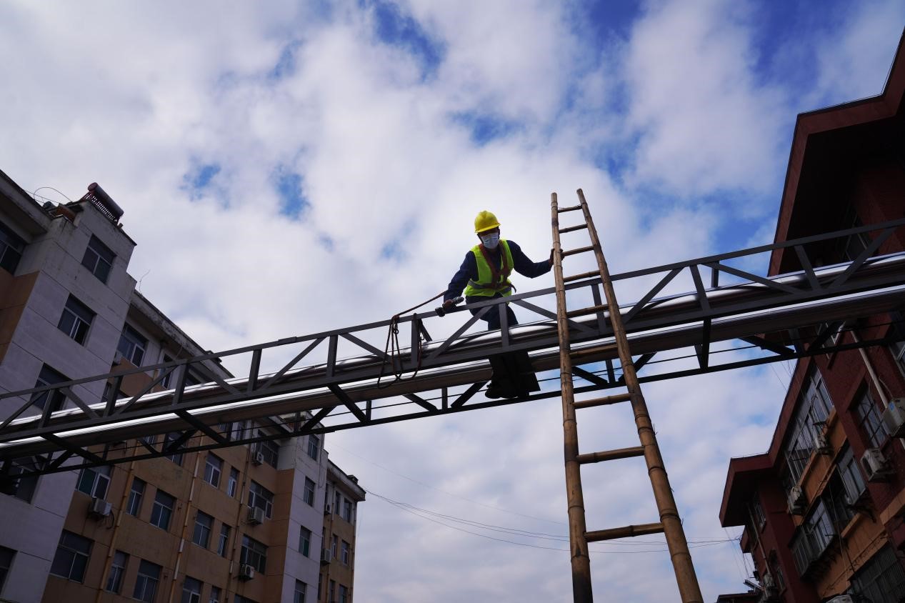 A worker is reinforcing pipelines of a heating network in a residential area in Daixi neighborhood, Zouping, east China’s Shandong province, Nov. 6, 2021. (People’s Daily Online/Dong Naide)