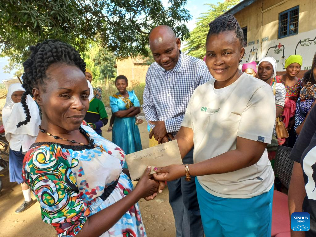 Rozalia Grayson Rwegasira (R, Front), Assistant Administrative Secretary in Economic and Productive Sector of the Morogoro regional commissioner's office, presents the award of Peapea village's best soybean farmer for 2022 in Morogoro, Tanzania, on June 23, 2022. Soy milk, a traditional Chinese drink rich in flavor and nutrition, is becoming an increasingly popular drink among Tanzanians in villages in the Morogoro region west of Dar es Salaam. (China Agricultural University/Handout via Xinhua)