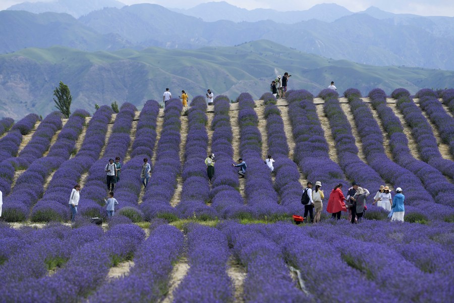 Tourists visit a lavender field in Huocheng County, northwest China's Xinjiang Uygur Autonomous Region, June 19, 2022. (Xinhua/Zhao Ge)