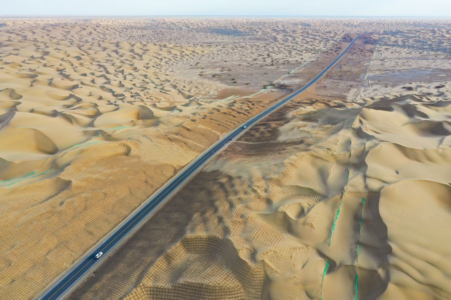 Aerial photo shows a new highway traversing the Taklimakan Desert in northwest China's Xinjiang Uygur Autonomous Region, June 23, 2022. (Xinhua/Gu Yu)