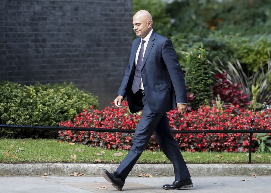 Sajid Javid arrives at 10 Downing Street in London, Britain, on Sept. 15, 2021. (Xinhua/Han Yan)