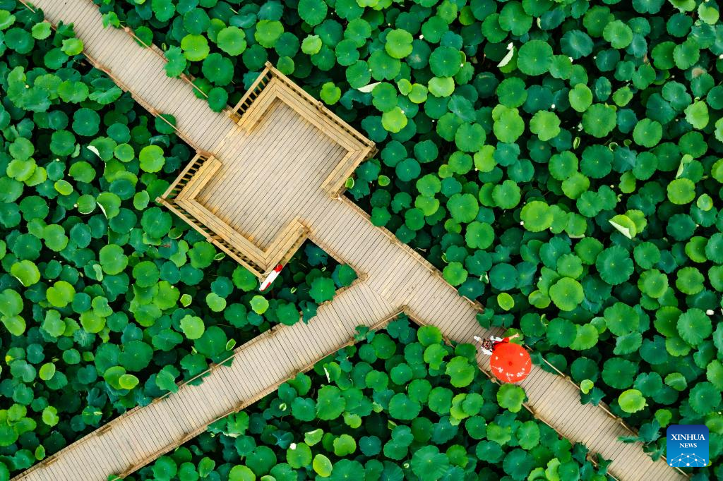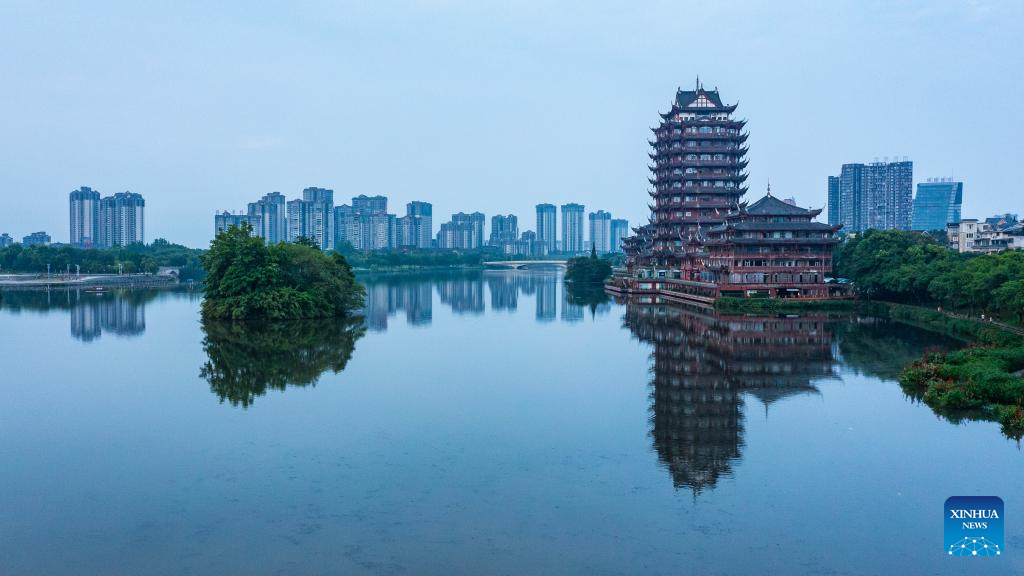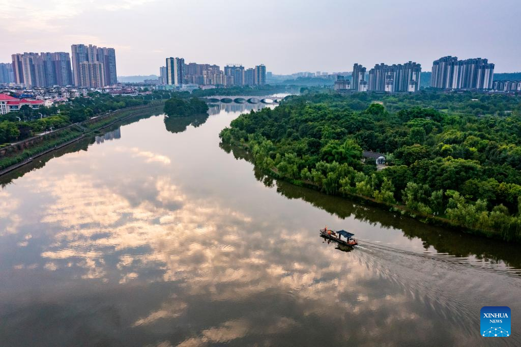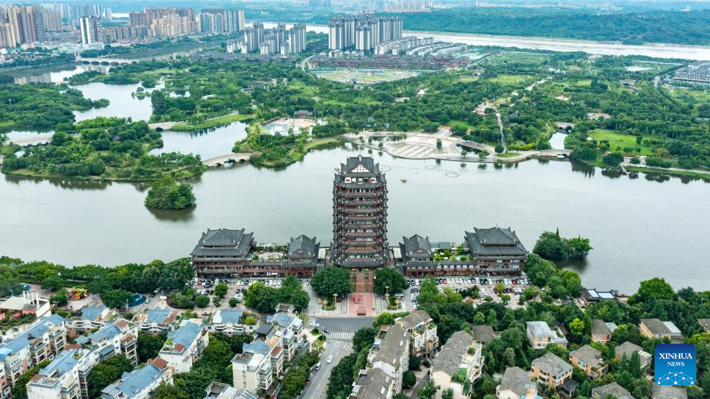 Aerial photo taken on June 24, 2022 shows a view of a wetland park in Meishan, southwest China's Sichuan Province. (Xinhua/Shen Bohan)