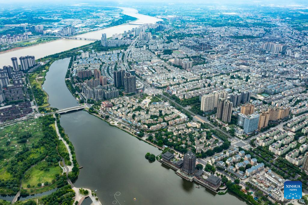 Aerial photo taken on June 24, 2022 shows a city view of Meishan, southwest China's Sichuan Province. (Xinhua/Shen Bohan)