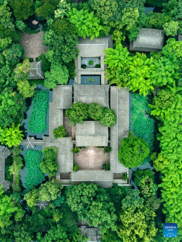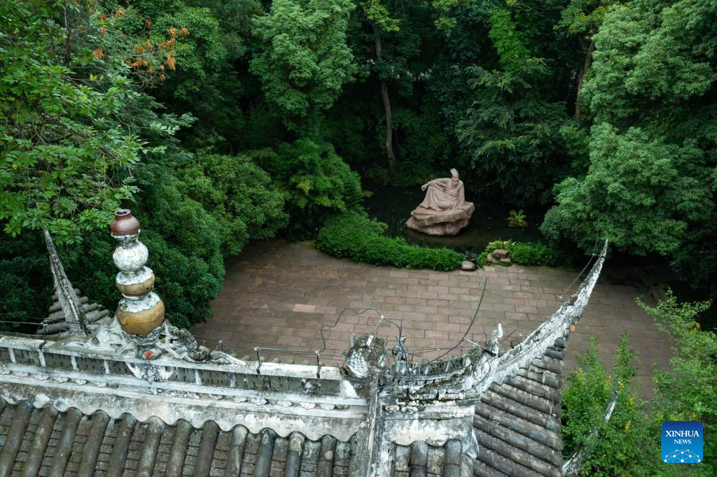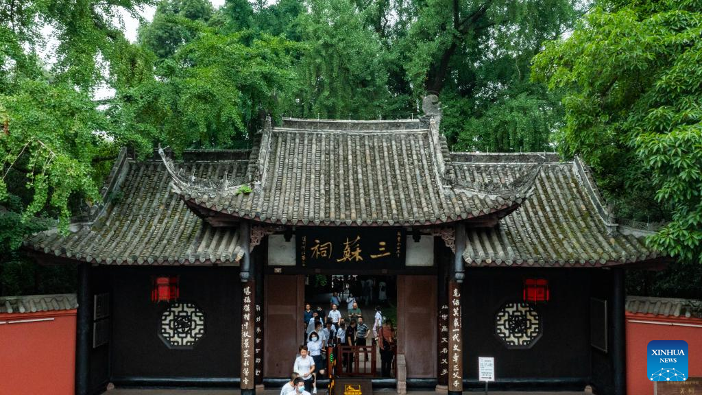 Aerial photo taken on June 22, 2022 shows a view of San Su Ci, the memorial temple and former residence of Su Xun and his two sons Su Shi and Su Zhe, three literary masters of the Northern Song Dynasty (960-1127), in Meishan, southwest China's Sichuan Province. (Xinhua/Shen Bohan)
