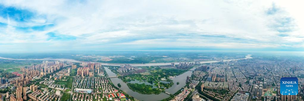 Aerial panoramic photo taken on June 23, 2022 shows a city view of Meishan, southwest China's Sichuan Province. (Xinhua/Shen Bohan)