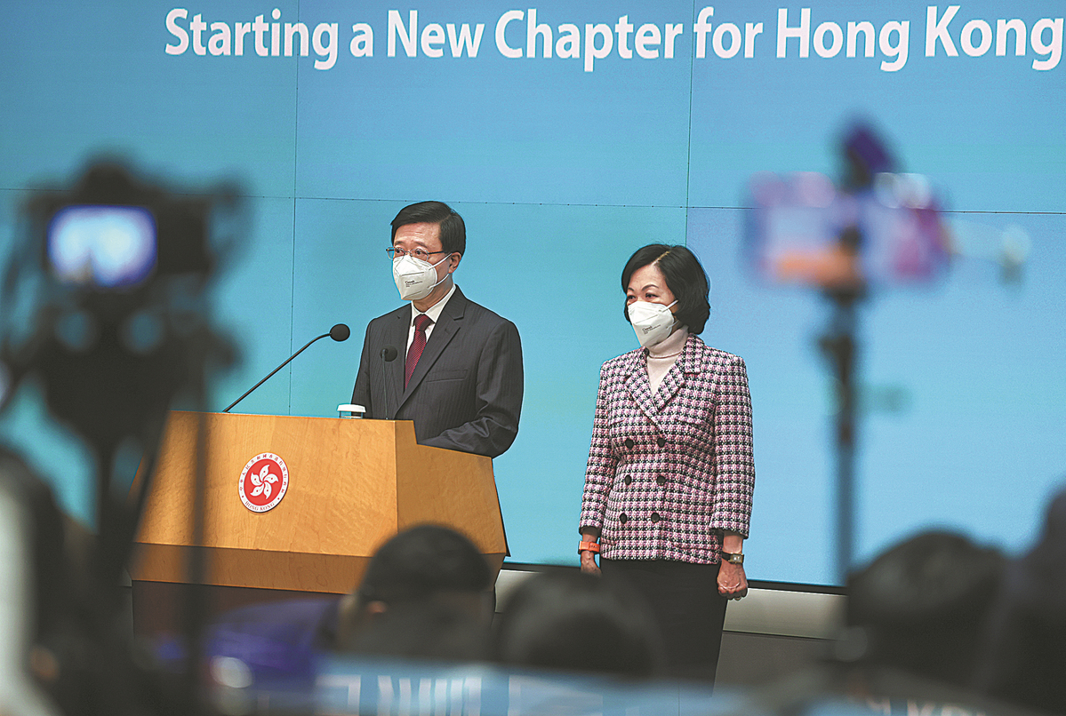 Hong Kong Chief Executive John Lee Ka-chiu (left) and Regina Ip Lau Suk-yee, convenor of the Executive Council, meet with reporters at the Central Government Office in Hong Kong, on Tuesday. CALVIN NG/CHINA DAILY