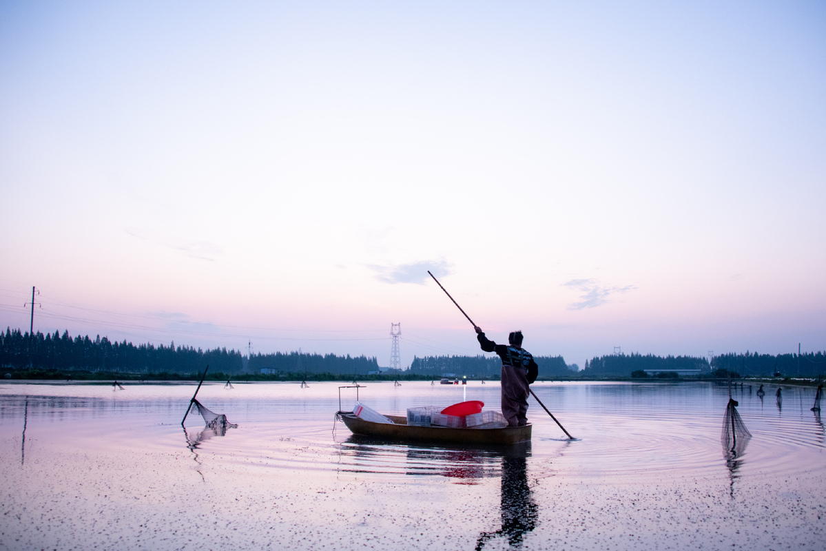 A breeder catches crayfishes at a farm in Qianjiang, Hubei province, June 25, 2022. [Photo/Xinhua]