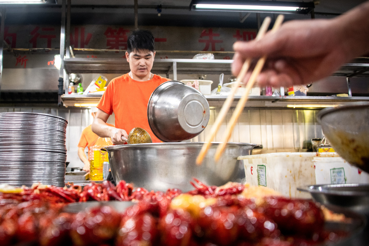 A chef makes a crayfish dish at a restaurant in Qianjiang, Hubei province, June 25, 2022. [Photo/Xinhua]