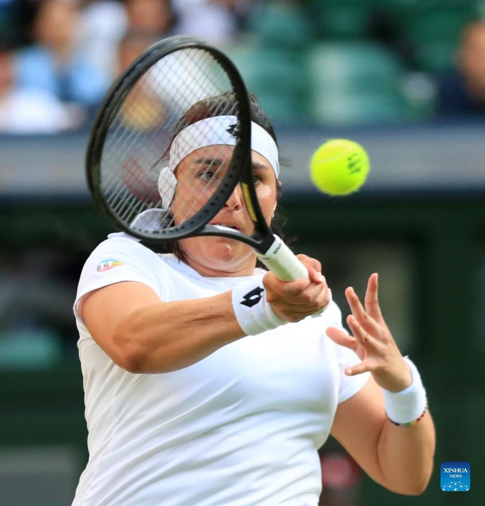 Ons Jabeur of Tunisia hits a return during the women's singles quarter-final match against Marie Bouzkova of the Czech Republic at Wimbledon Tennis Championship in London, Britain, on July 5, 2022. (Xinhua/Li Ying)