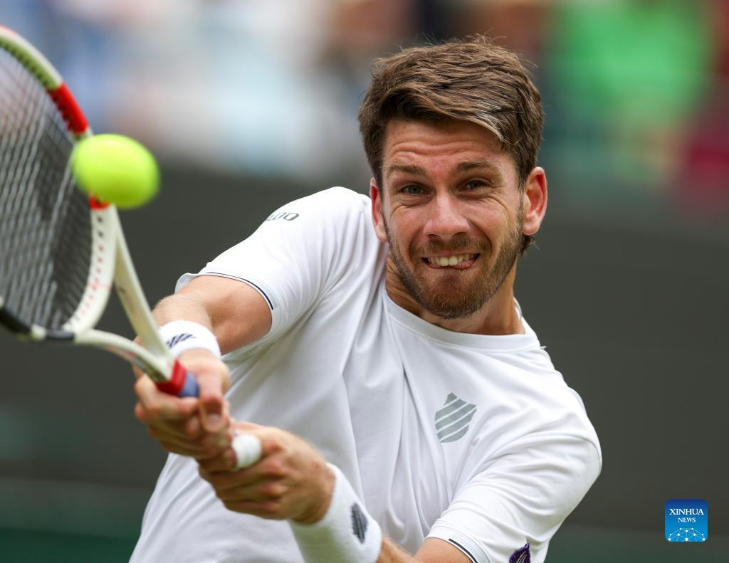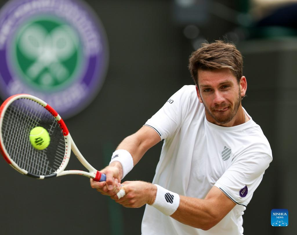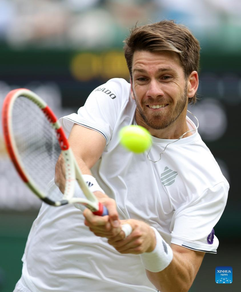 Cameron Norrie of Britain hits a return during the men's singles quarter-final match against David Goffin of Belgium at Wimbledon Tennis Championship in London, Britain, on July 5, 2022. (Xinhua/Han Yan)