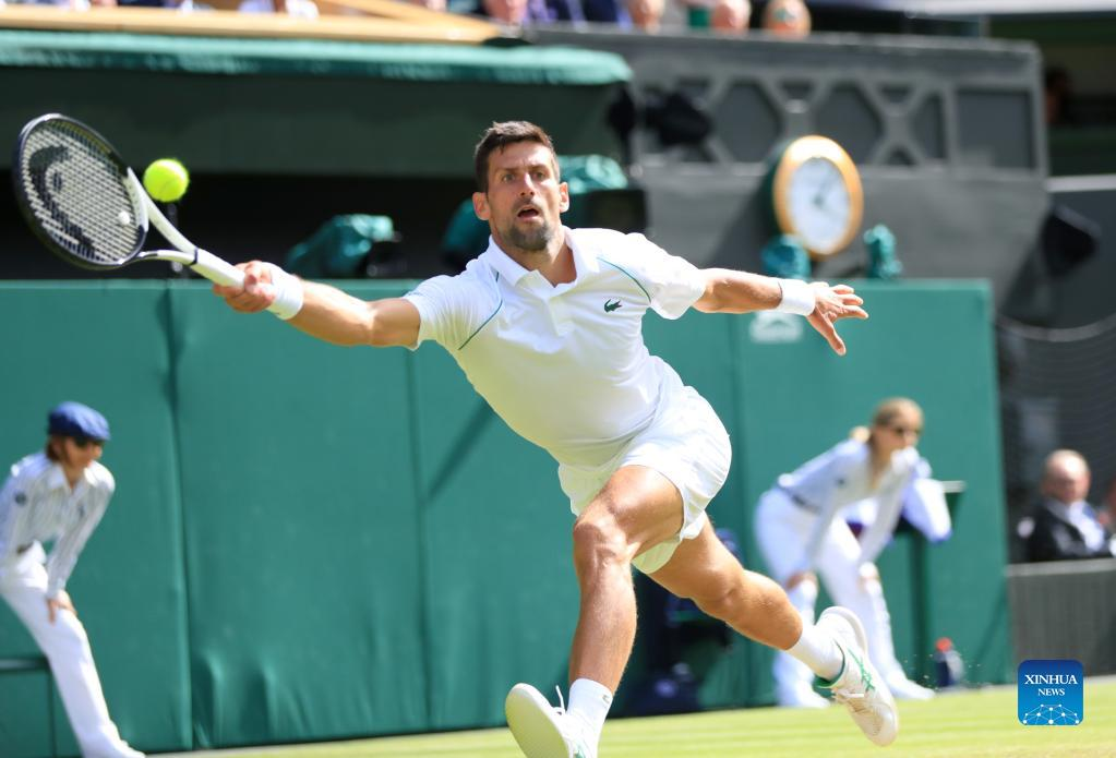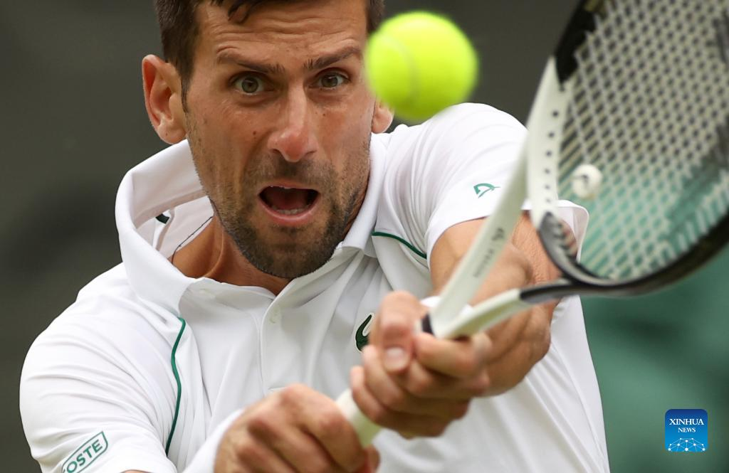 Novak Djokovic of Serbia hits a return during the men's singles quarter-final match against Jannik Sinner of Italy at Wimbledon Tennis Championship in London, Britain, on July 5, 2022. (Xinhua/Li Ying)