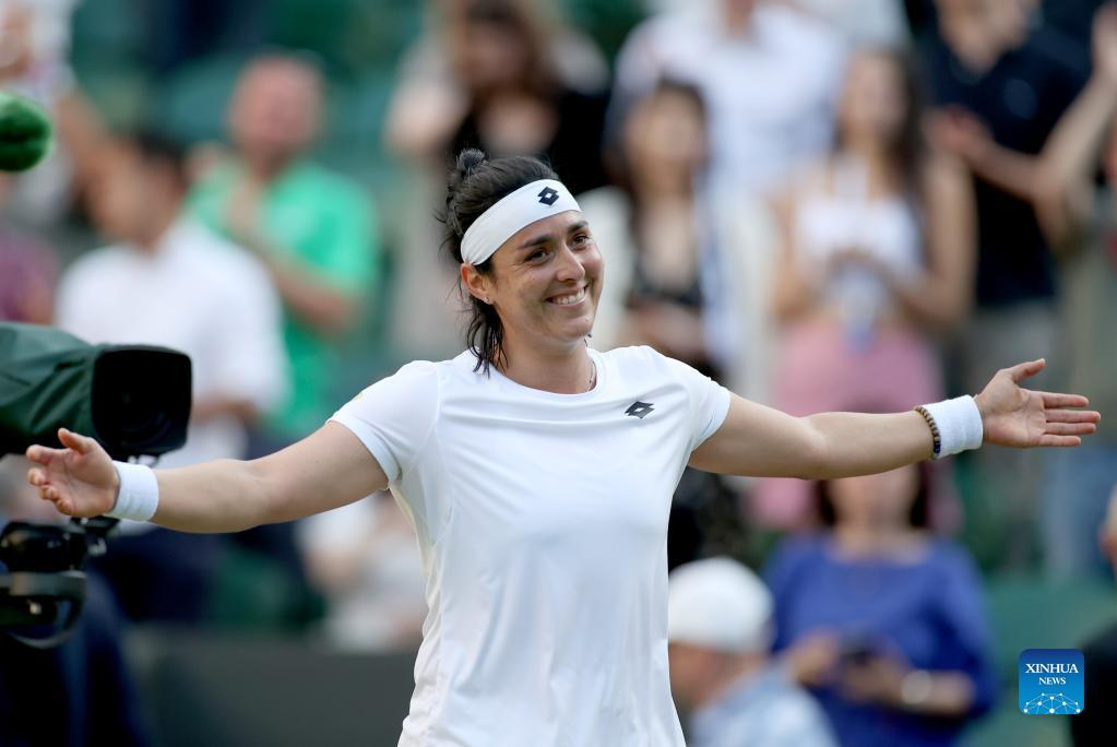 Ons Jabeur of Tunisia celebrates after winning the women's singles quarter-final match against Marie Bouzkova of the Czech Republic at Wimbledon Tennis Championship in London, Britain, on July 5, 2022. (Xinhua/Li Ying)