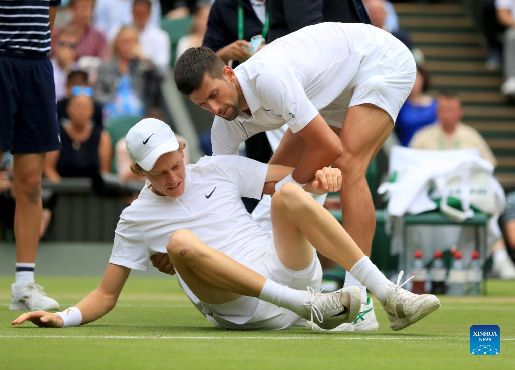 Novak Djokovic (R) of Serbia helps Jannik Sinner of Italy stand up after Sinner slipped during their men's singles quarter-final match at Wimbledon Tennis Championship in London, Britain, on July 5, 2022. (Xinhua/Li Ying)