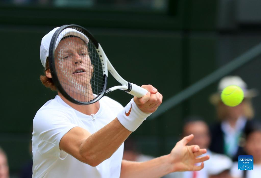 Jannik Sinner of Italy hits a return during the men's singles quarter-final match against Novak Djokovic of Serbia at Wimbledon Tennis Championship in London, Britain, on July 5, 2022. (Xinhua/Li Ying)