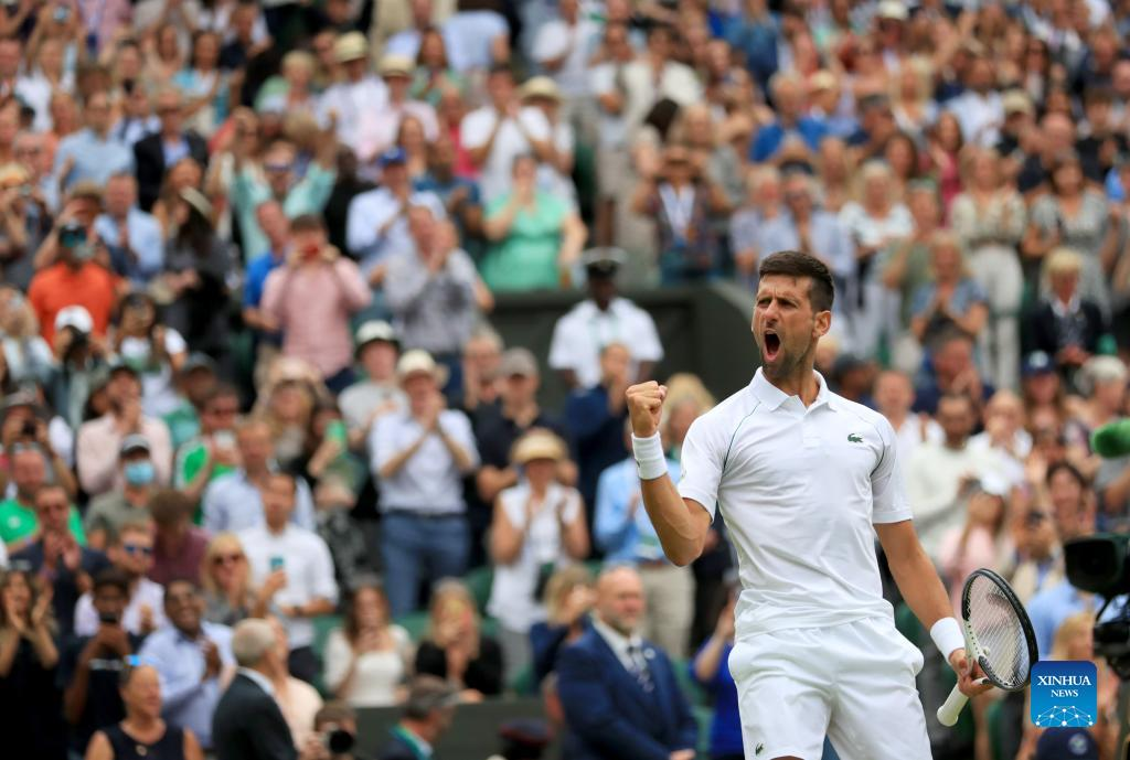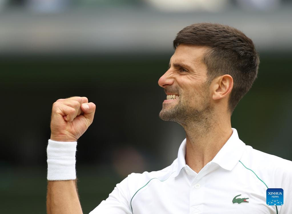 Novak Djokovic of Serbia celebrates after winning the men's singles quarter-final match against Jannik Sinner of Italy at Wimbledon Tennis Championship in London, Britain, on July 5, 2022. (Xinhua/Li Ying)