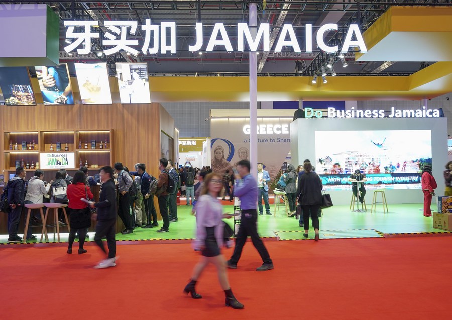 Visitors walk past the Jamaica pavilion during the second China International Import Expo (CIIE) in Shanghai, east China, Nov. 6, 2019. (Xinhua/Yin Gang)