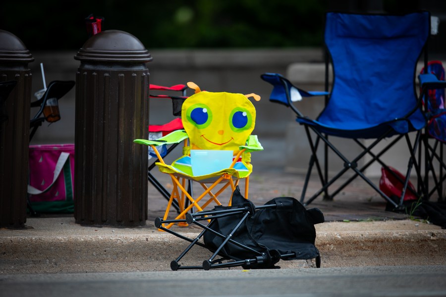 A child's chair sits empty after it was abandoned in a hurry during a mass shooting in Highland Park, Illinois, the United States, July 4, 2022. (Photo by Vincent Johnson/Xinhua)