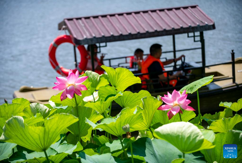 Visitors enjoy lotus flowers at Daguan Park in Kunming, southwest China's Yunnan Province, July 6, 2022.