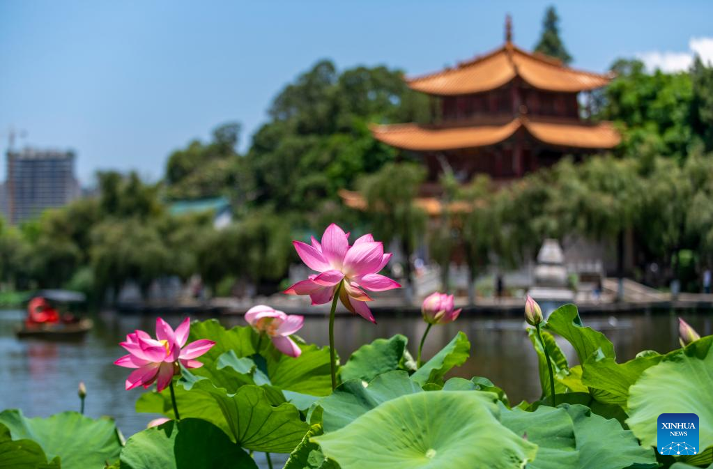 Photo taken on July 6, 2022 shows lotus flowers at Daguan Park in Kunming, southwest China's Yunnan Province.