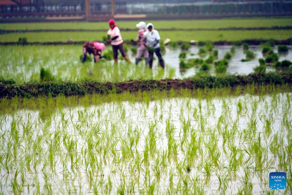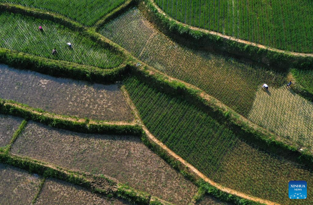 Farmers work in a rice field in Shanligezhuang Village of Zunhua City, north China's Hebei Province, July 6, 2022. (Photo by Liu Mancang/Xinhua)