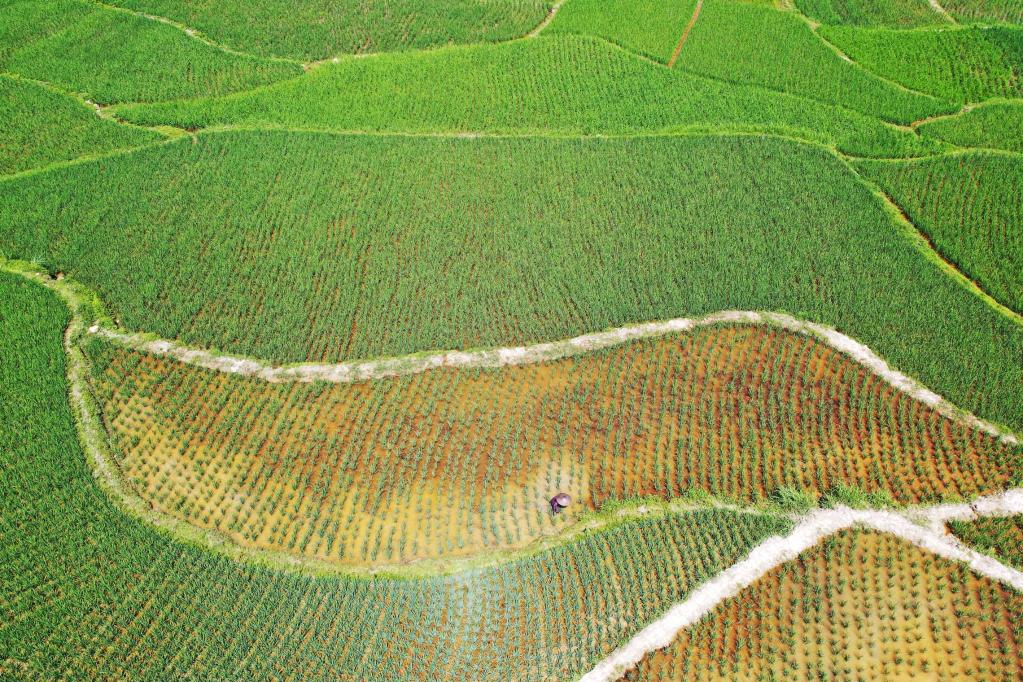 Aerial photo shows a farmer working in the fields in Fanjingshan Village of Tongren City, southwest China's Guizhou Province, July 6, 2022. (Photo by Li He/Xinhua)