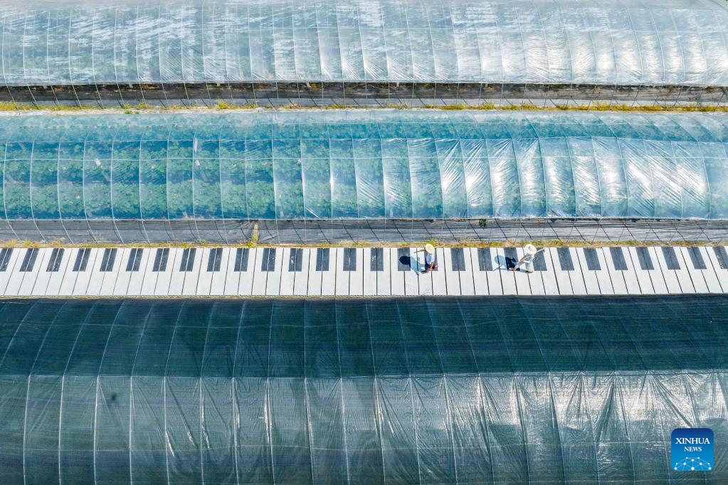 A villager works at a kiwi fruit orchard in Qianliang Village of Zaozhuang City, east China's Shandong Province, July 6, 2022. (Photo by Sun Yang/Xinhua)