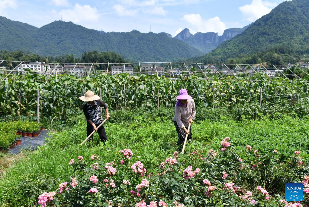 Farmers work in a field in Chenjiaba Village of Zigui County, central China's Hubei Province, July 6, 2022. (Photo by Wang Huifu/Xinhua)