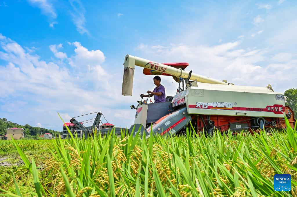 A harvester works in a rice field in Huaqiao Village of Shuangfeng County, central China's Hunan Province, July 6, 2022. (Photo by Li Jianxin/Xinhua)