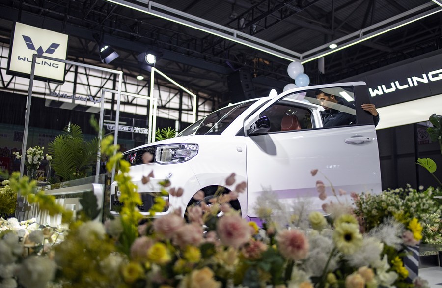 File photo shows a visitor looking at a new energy vehicle (NEV) during a promotional activity for NEVs in rural areas held in Kunming, southwest China's Yunnan Province. (Xinhua/Jiang Wenyao)