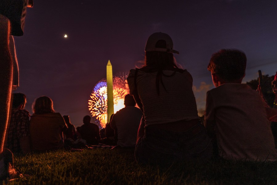 Fireworks explode over the National Mall to celebrate U.S. Independence Day in Washington, D.C., the United States, July 4, 2022. (Photo by Aaron Schwartz/Xinhua)