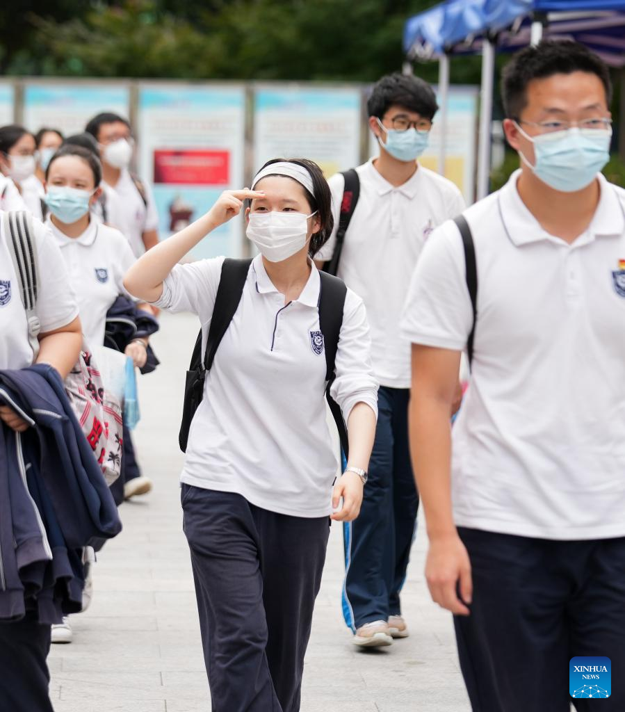 Examinees walk out of an exam site at Shixi High School in east China's Shanghai, July 7, 2022.