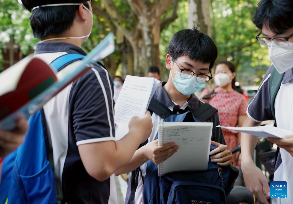Examinees prepare for the exams outside an exam site at Nanyang Model High School in east China's Shanghai, July 7, 2022.