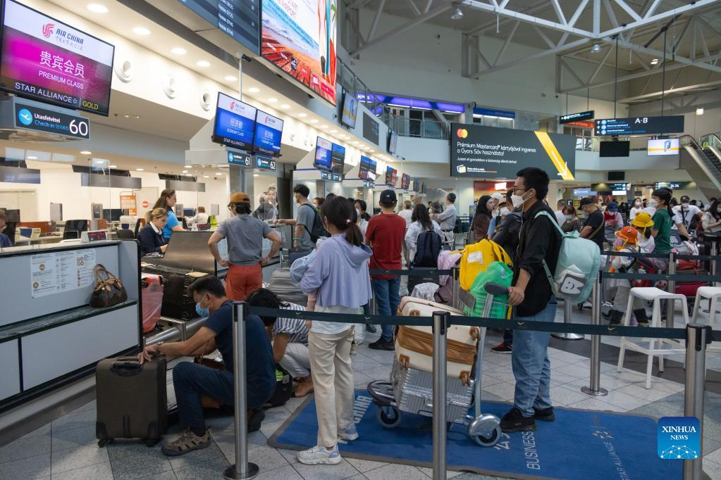 Passengers line up to check in at Air China's counters at Budapest Ferenc Liszt International Airport in Budapest, Hungary, on July 7, 2022. A direct flight from Beijing landed at Budapest's Ferenc Liszt International Airport Thursday, marking the official resumption of regular passenger flights between Hungary and China. (Photo by Attila Volgyi/Xinhua)