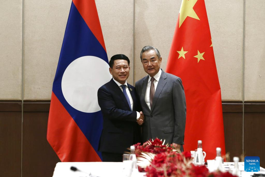 BANGKOK, Aug. 15 (Xinhua) -- Chinese Foreign Minister Wang Yi met with Lao Deputy Prime Minister and Foreign Minister Saleumxay Kommasith in Chiang Mai, Thailand on Thursday on strengthening bilateral relations and cooperation on regional issues, and the situation in Myanmar.