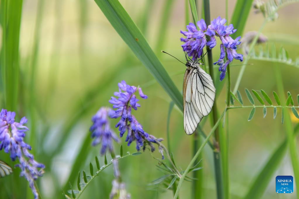 A butterfly perches on a flower at a national wetland park in Genhe, Hulun Buir, north China's Inner Mongolia Autonomous Region, July 7, 2022. (Xinhua/Bei He)