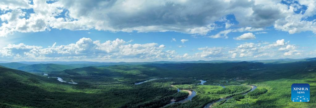 Aerial panoramic photo taken on July 7, 2022 shows the scenery of a national wetland park in Genhe, Hulun Buir, north China's Inner Mongolia Autonomous Region. (Xinhua/Bei He)