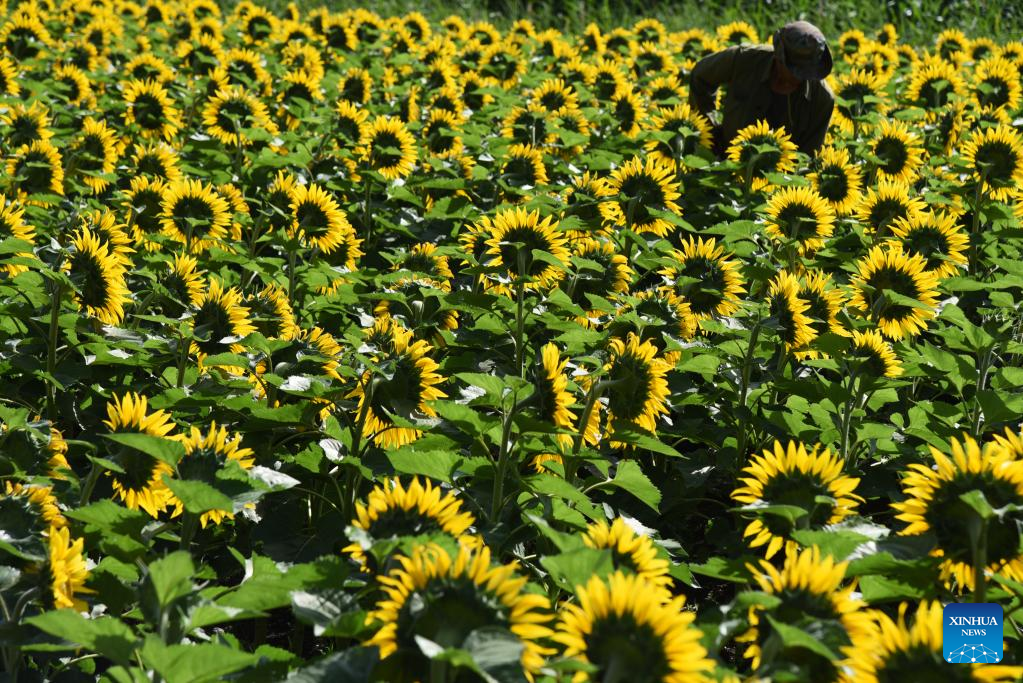 A villager removes weed at a sunflower field in Huangshan subdistrict of Yulong Naxi Autonomous County in Lijiang City, southwest China's Yunnan Province, July 7, 2022. Xiaoshu, or Lesser Heat, falls on July 7 this year, which means the beginning of hot summer. (Photo by Zhao Qingzu/Xinhua)