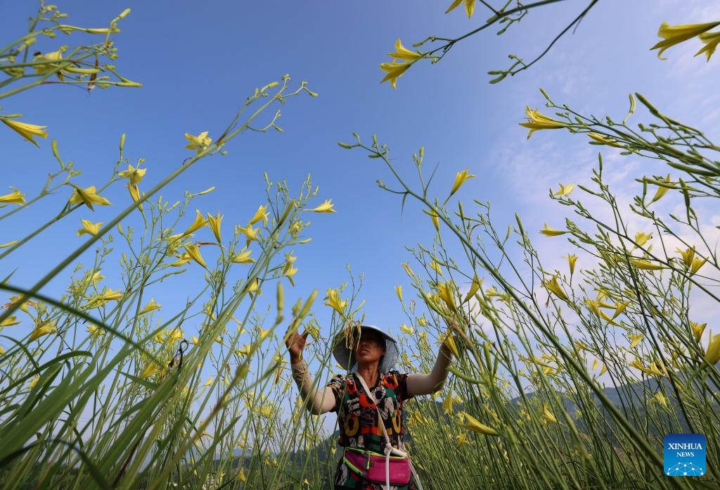 A farmer picks day lily in Gelin Town of Zheng'an County in Zunyi City, southwest China's Guizhou Province, July 7, 2022. Xiaoshu, or Lesser Heat, falls on July 7 this year, which means the beginning of hot summer. (Photo by Zhao Yongzhang/Xinhua)
