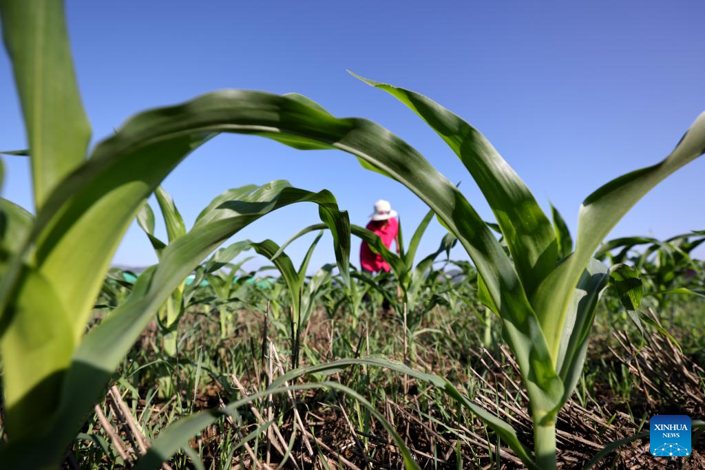 A farmer works at a corn field in Mengzhuang Town of Shizhong District of Zaozhuang, east China's Shandong Province, July 7, 2022. Xiaoshu, or Lesser Heat, falls on July 7 this year, which means the beginning of hot summer. (Photo by Sun Zhongzhe/Xinhua)