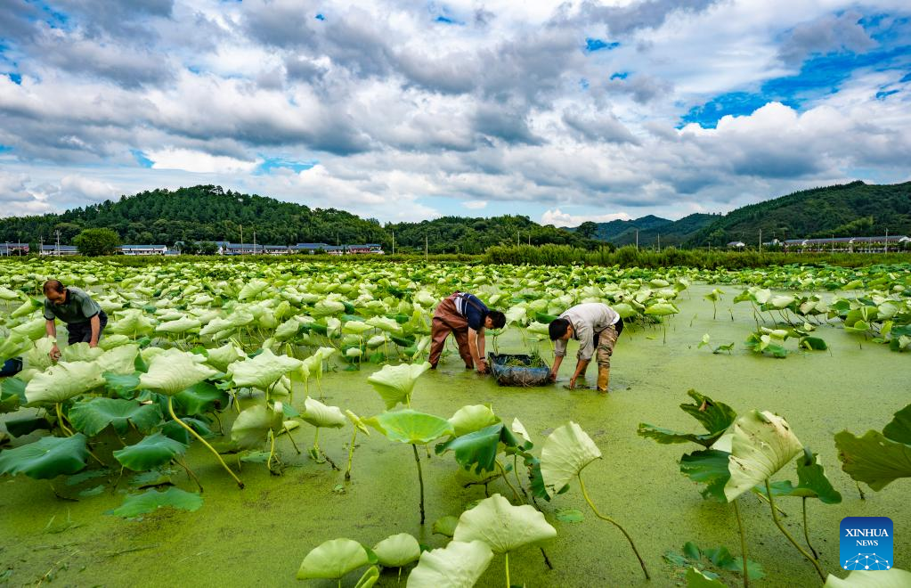 Farmers work at a lotus field in Jiulongshan Township of Xinyu City, east China's Jiangxi Province, July 7, 2022. Xiaoshu, or Lesser Heat, falls on July 7 this year, which means the beginning of hot summer. (Photo by Zhao Chunliang/Xinhua)