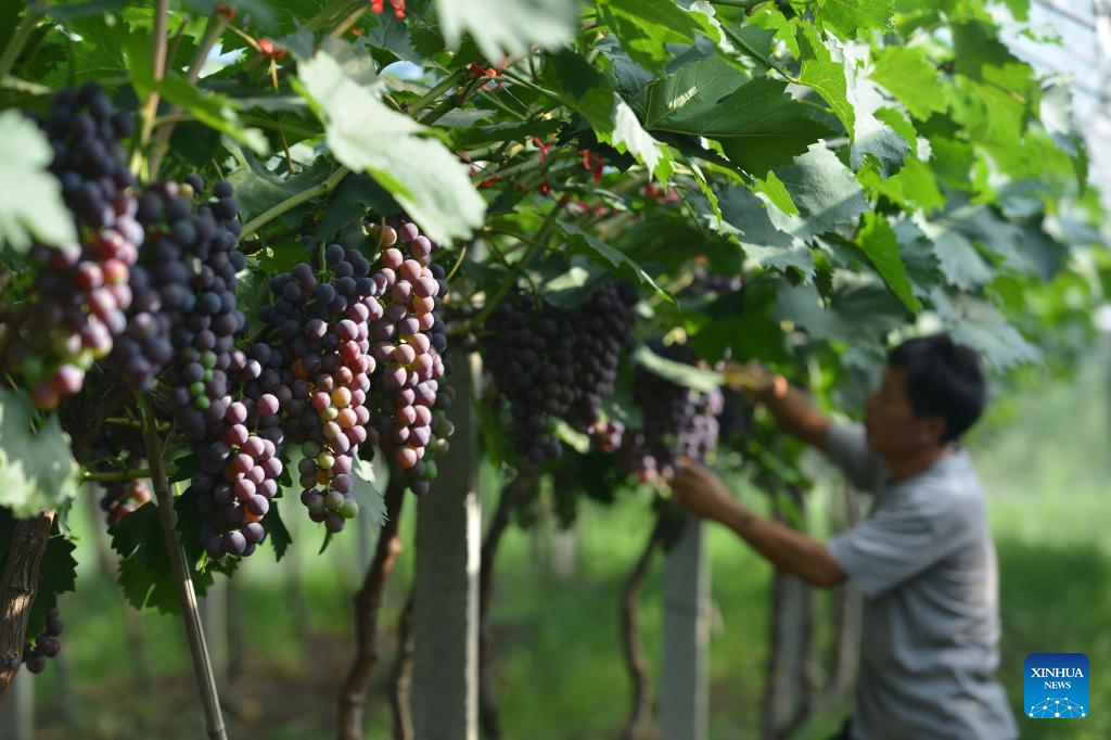 A villager picks grapes at a farm in Lyuzhai Town of Linquan County, Fuyang City, east China's Anhui Province, July 7, 2022. Xiaoshu, or Lesser Heat, falls on July 7 this year, which means the beginning of hot summer. (Photo by Lu Qijian/Xinhua)