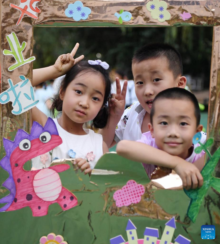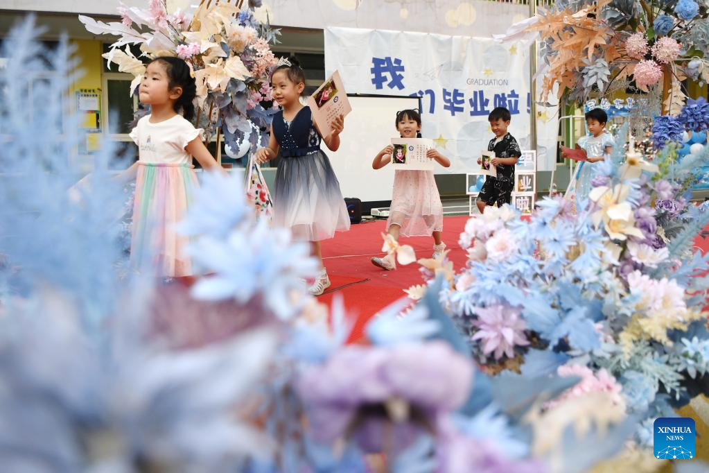 Children pose for pictures during their graduation ceremony at a kindergarten in Xigu District of Lanzhou, northwest China's Gansu Province, July 6, 2022. (Xinhua/Chen Bin)