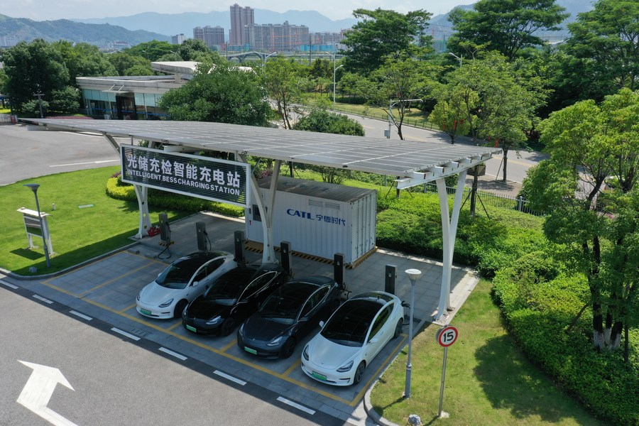 Aerial photo taken on June 24, 2022 shows an intelligent BESS charging station in the headquarters of Contemporary Amperex Technology Co., Ltd. (CATL) in Ningde, east China's Fujian Province. (Xinhua/Lin Shanchuan)