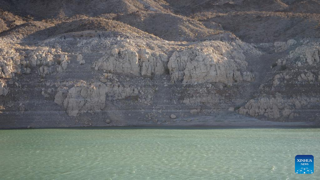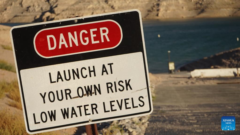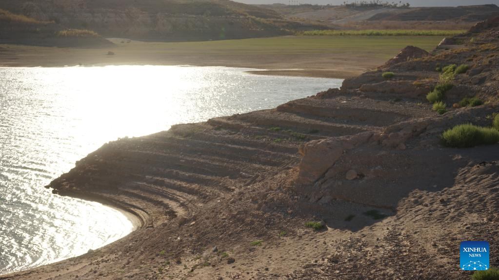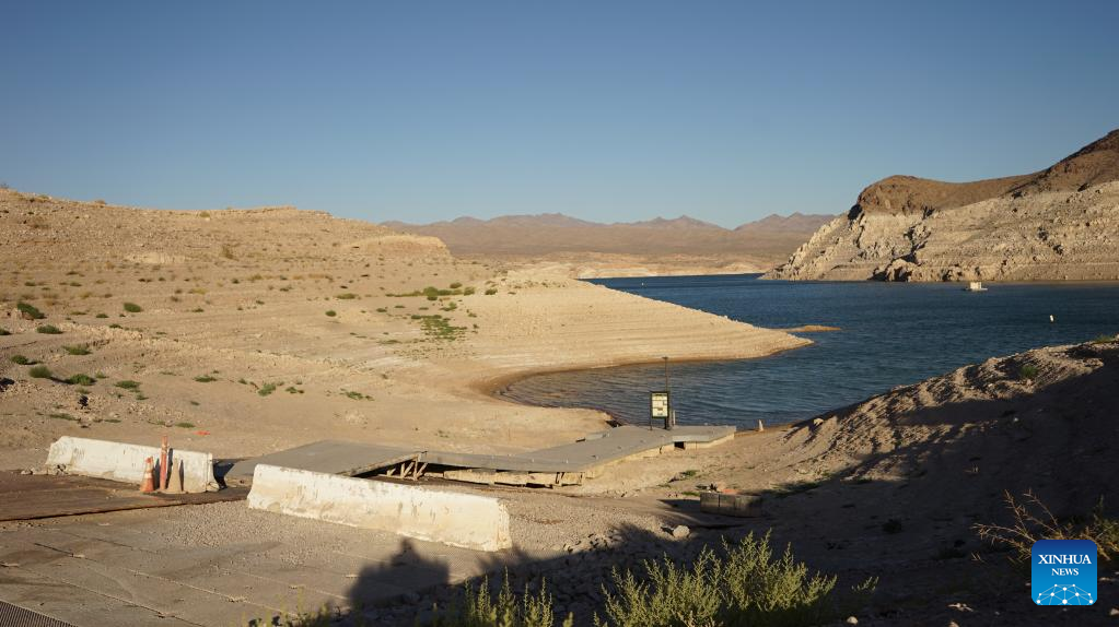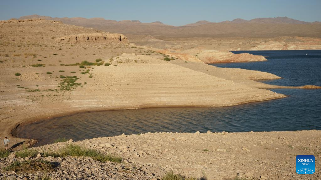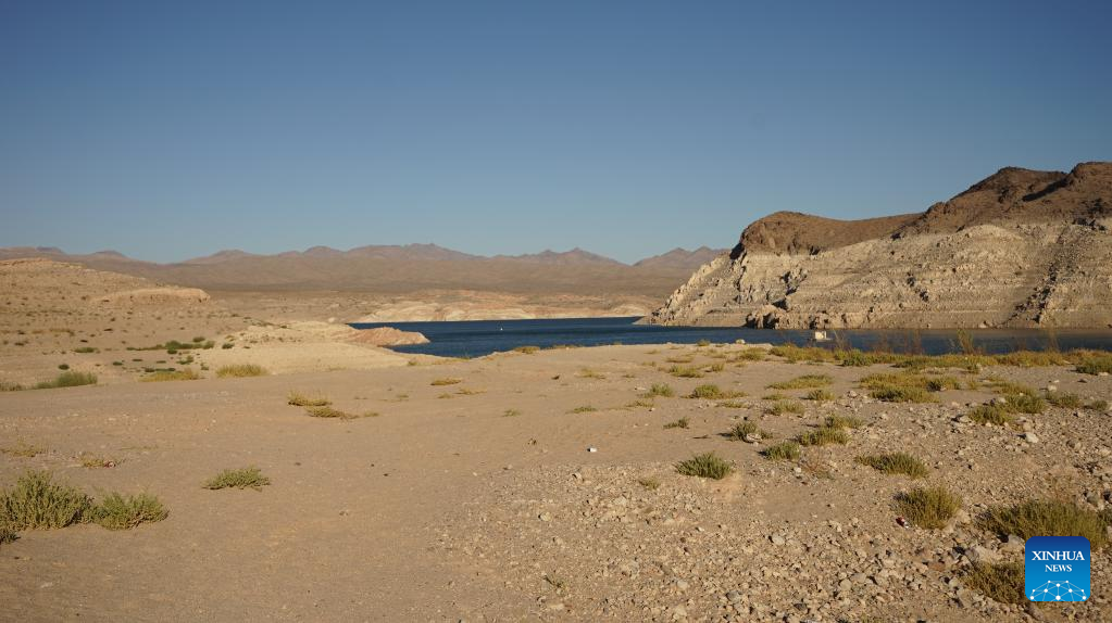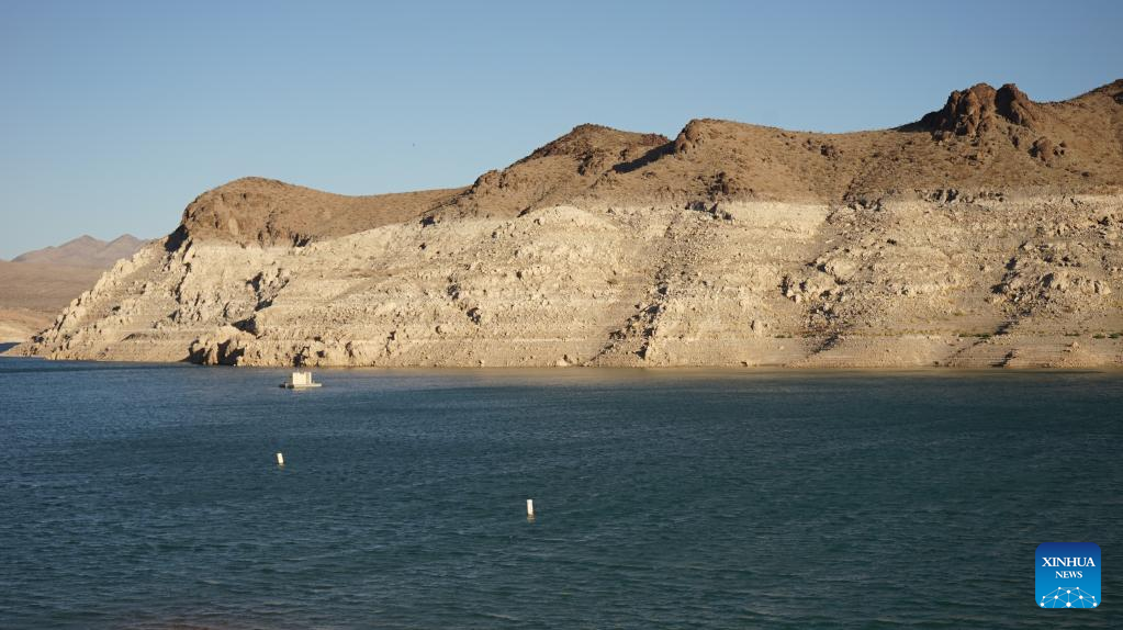 LOS ANGELES, July 8 (Xinhua) -- Surrounded by a white band of dried rocks, the vast drop in water levels is visible this week at Lake Mead, the biggest reservoir in the United States, which has been shrinking amid a two-decade-long megadrought.