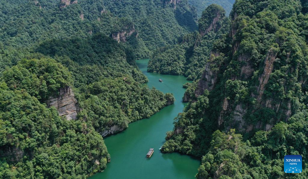 Aerial photo shows tourists visiting the Wulingyuan scenic area in Zhangjiajie, central China's Hunan Province, July 8, 2022. As the summer vacation approaches, Zhangjiajie, a popular tourist destination in Hunan Province, has taken a series of measures to boost the recovery of tourism. (Xinhua/Zhao Zhongzhi)