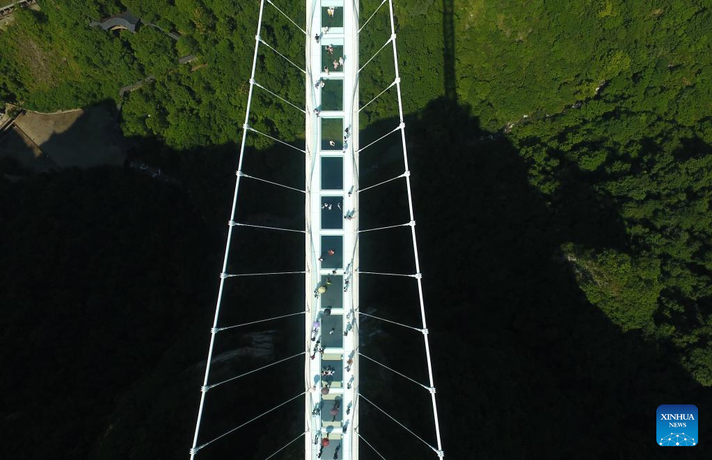 Aerial photo shows tourists walking on a glass-bottomed bridge at Zhangjiajie Grand Canyon, central China's Hunan Province, July 8, 2022. As the summer vacation approaches, Zhangjiajie, a popular tourist destination in Hunan Province, has taken a series of measures to boost the recovery of tourism. (Xinhua/Zhao Zhongzhi)