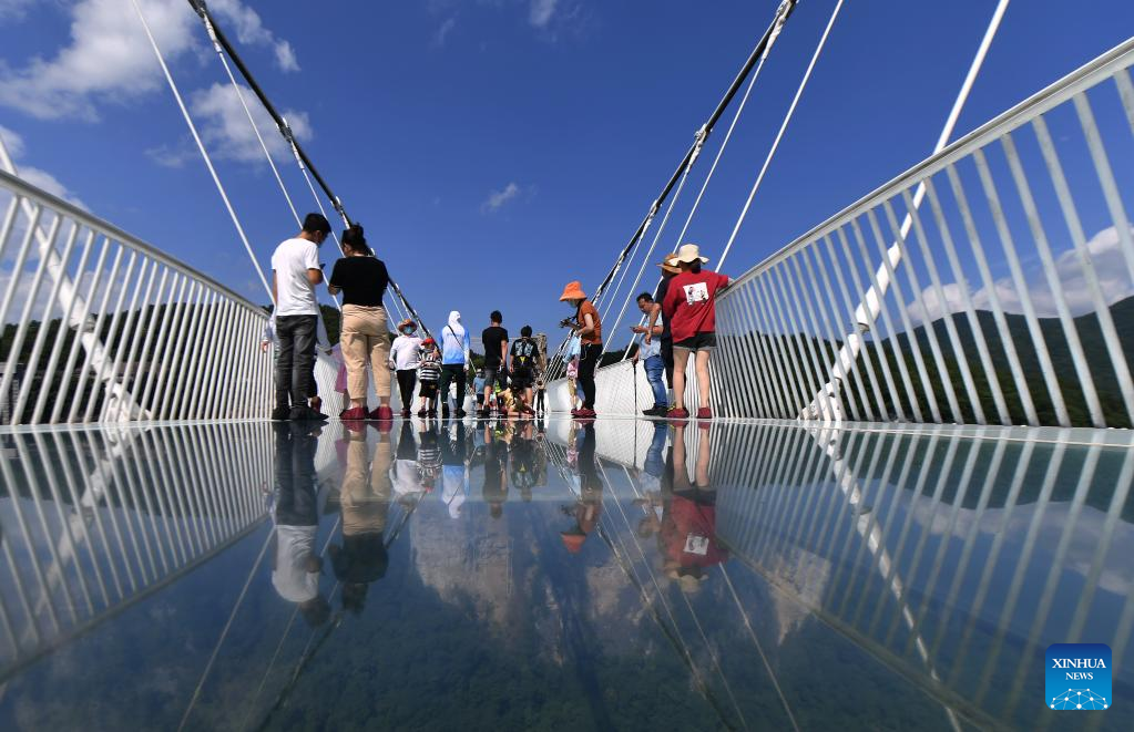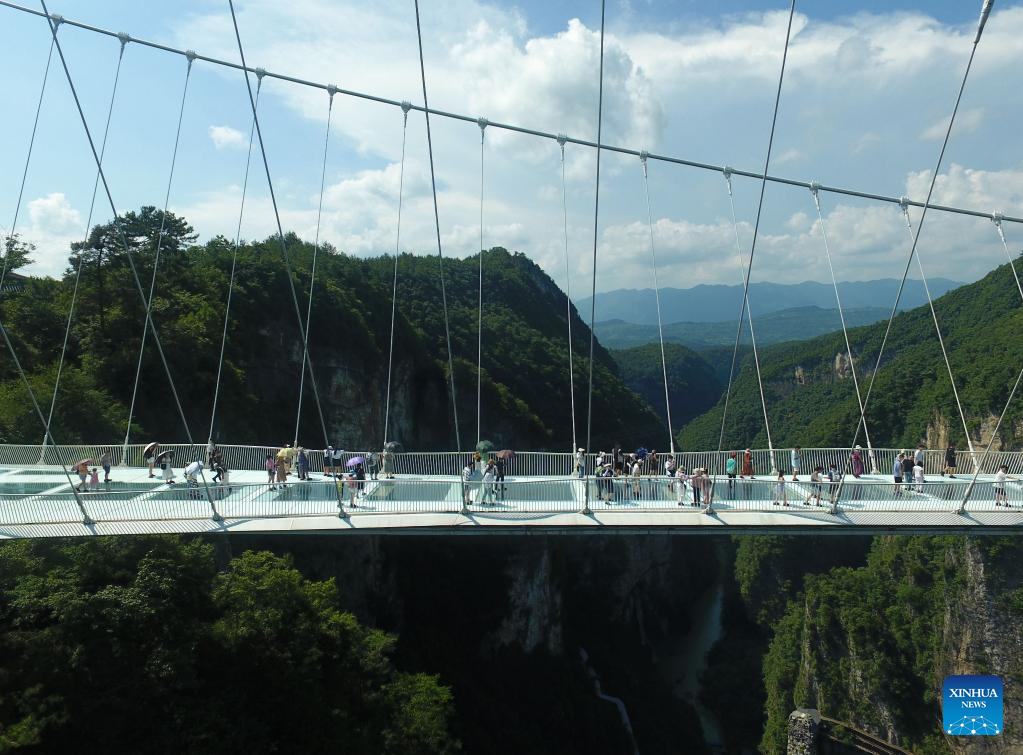 Tourists walk on a glass-bottomed bridge at Zhangjiajie Grand Canyon, central China's Hunan Province, July 8, 2022. As the summer vacation approaches, Zhangjiajie, a popular tourist destination in Hunan Province, has taken a series of measures to boost the recovery of tourism. (Xinhua/Zhao Zhongzhi)