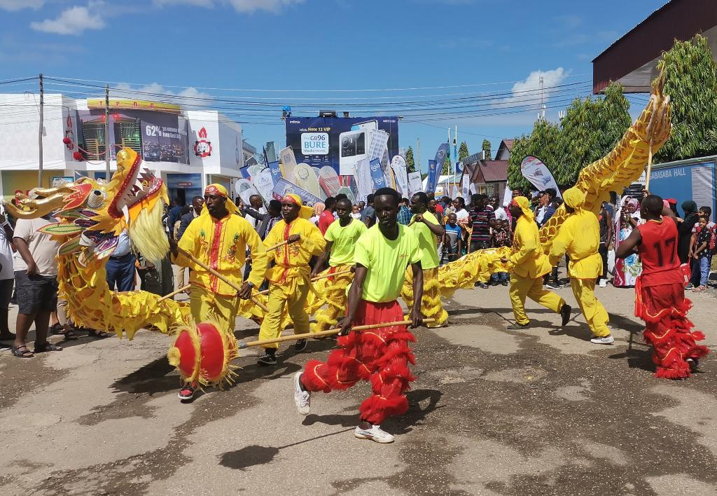 A dragon dance is performed during the 46th Dar es Salaam International Trade Fair in Dar es Salaam, Tanzania, on July 7, 2022. Tens of hundreds of local and foreign visitors to the 46th Dar es Salaam International Trade Fair (DITF) are flocking to the Chinese pavilion to seek information on a range of products on display. (Xinhua)